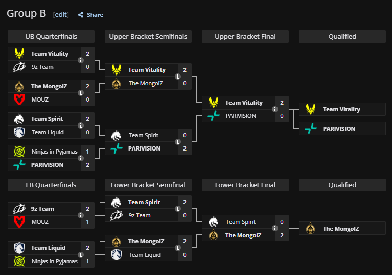 Team Vitality пройшли групу ідеально — три серії 2:0 (проти 9z, MongolZ і PARIVISION). Французи виглядають найбільш стабільною командою турніру і йдуть у півфінал з найкращим враженням.