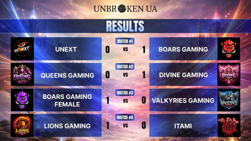 Жіночий склад BOARS GAMING FEMALE підтвердив статус лідерів, видавши феноменальну гру проти «Валькірій». Хоча VALKYRIES GAMING намагалися грати максимально обережно та шукати свої моменти, «Кабани» повністю контролювали карту, нарощуючи перевагу по фарму. Матч завершився блискучою ініціативою, покаранням суперниць за помилку та ефектним Savage, який поставив яскраву крапку в цій зустрічі.