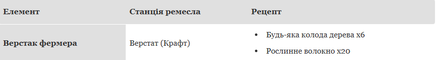 Перш за все вам знадобиться Верстак фермера. Це спеціальна станція крафту, яка дозволяє створювати інструменти, насіння та інші предмети, пов’язані з вирощуванням культур.