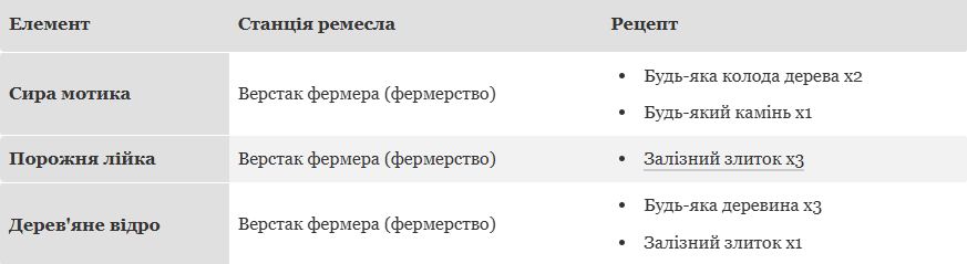• Дерев’яне відро з 3 одиниць деревини та 1 залізного злитка