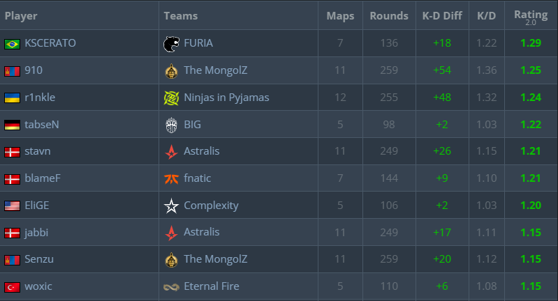 Кращим гравцем за рейтингом на турнірі є Кайке KSCERATO Церато, він за сім мап набив рейтинг 1.29. Але звання MVP турніру отримав Усухбаяр 910 Банзрагч, бо його колектив переміг на турнірі. Рейтинг монгола 1.25 за 11 мап.
