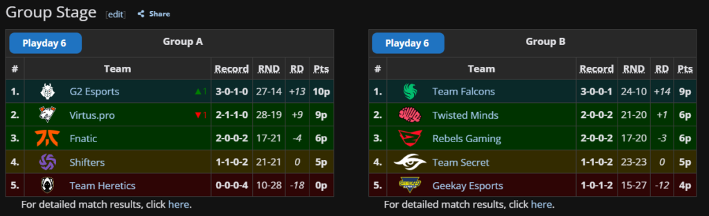 На четвертому місці завершили групову стадію Team Secret, які заробили 5 очок при абсолютно рівній різниці раундів 23-23. Це, мабуть, найкраще описує їхній виступ: команда виглядала боєздатно, але не настільки стабільно, щоб реально претендувати на лідерство в групі. Geekay Esports фінішували п’ятими з 4 очками та різницею раундів -12, і навряд чи можуть бути задоволені таким стартом турніру.