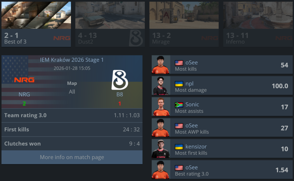 Не найкраще турнір розпочався і для B8. Українська команда поступилася NRG у напруженій серії з трьох мап, де ключову роль зіграв досвід oSee. Попри спроби повернутися в гру на вирішальній мапі, B8 не змогли дотиснути суперника та опустилися в нижню сітку Stage 1.