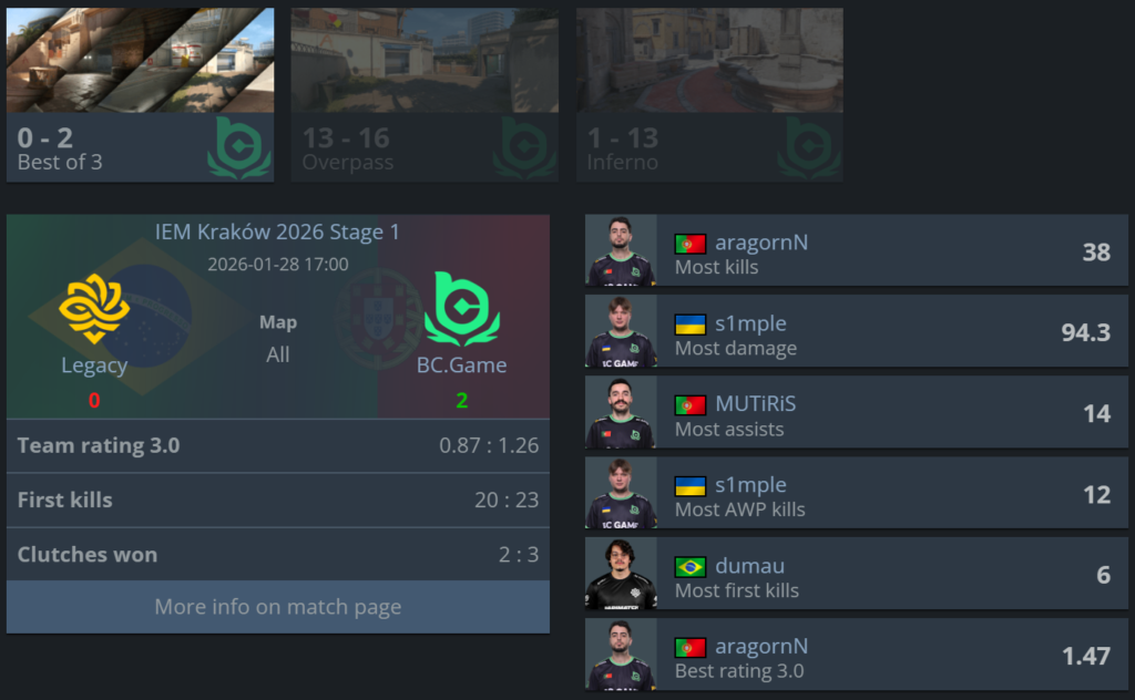 Водночас справжньою окрасою дня став виступ BC.Game. Команда оформила вольову перемогу над Legacy, відігравшись із великого відставання на Overpass, а на Inferno повністю домінувала. Впевнена гра та яскравий фінал серії стали серйозною заявою від оновленого складу на цьому турнірі.