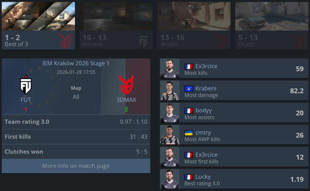 Для FUT стартовий день також завершився розчаруванням. Команда втратила кілька комфортних переваг у серії проти 3DMAX і в підсумку не змогла втримати матч під своїм контролем, поступившись у вирішальні моменти.