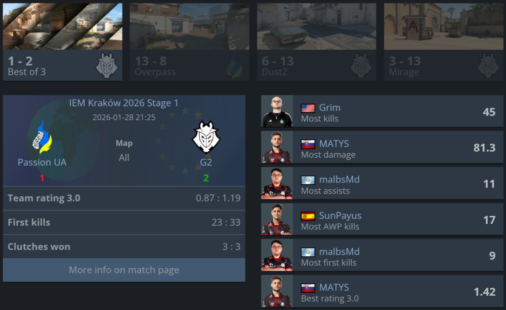 Останній матч ігрового дня завершився поразкою української організації Passion UA від G2. Попри впевнену перемогу на першій мапі, команді не вдалося розвинути успіх — G2 перехопили ініціативу та виграли дві наступні мапи, оформивши камбек і забравши серію bo3.