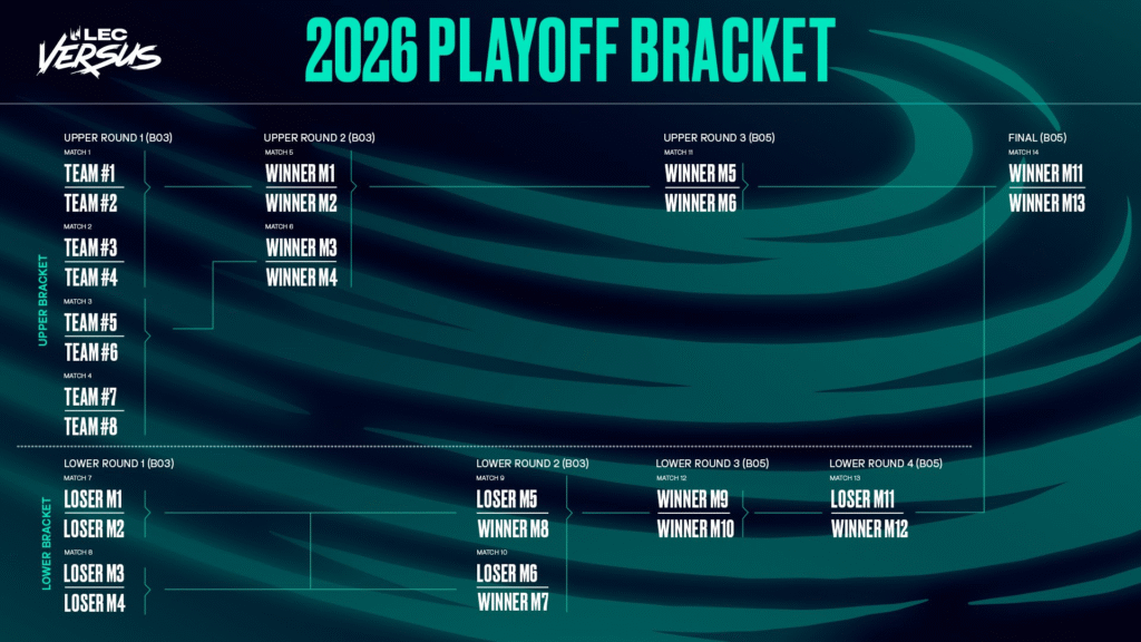 LEC Versus 2026 почнеться з групової стадії, де кожна команда зіграє з кожною. Всі матчі першої стадії будуть bo1. Після чого вісім кращих колективів пройдуть до плей-оф, де перший раунд буде bo3, а всі наступні матчі bo5.