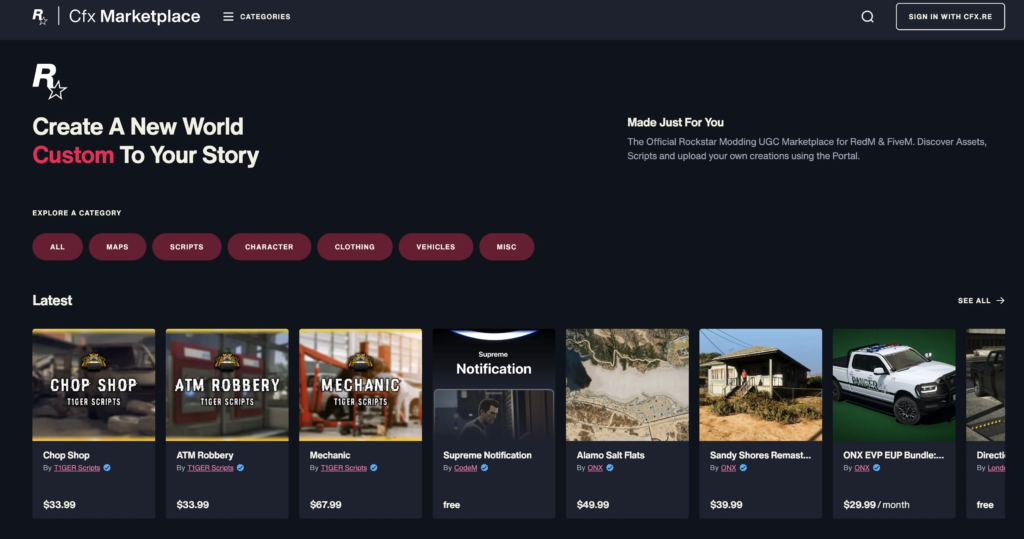 Rockstar Games повідомила про запуск Cfx Marketplace, офіційної торгової платформи для продажу користувацьких модифікацій до своїх ігор. Сервіс створено як інструмент монетизації контенту від спільноти та як легальний канал поширення модів, зокрема й для GTA 5.