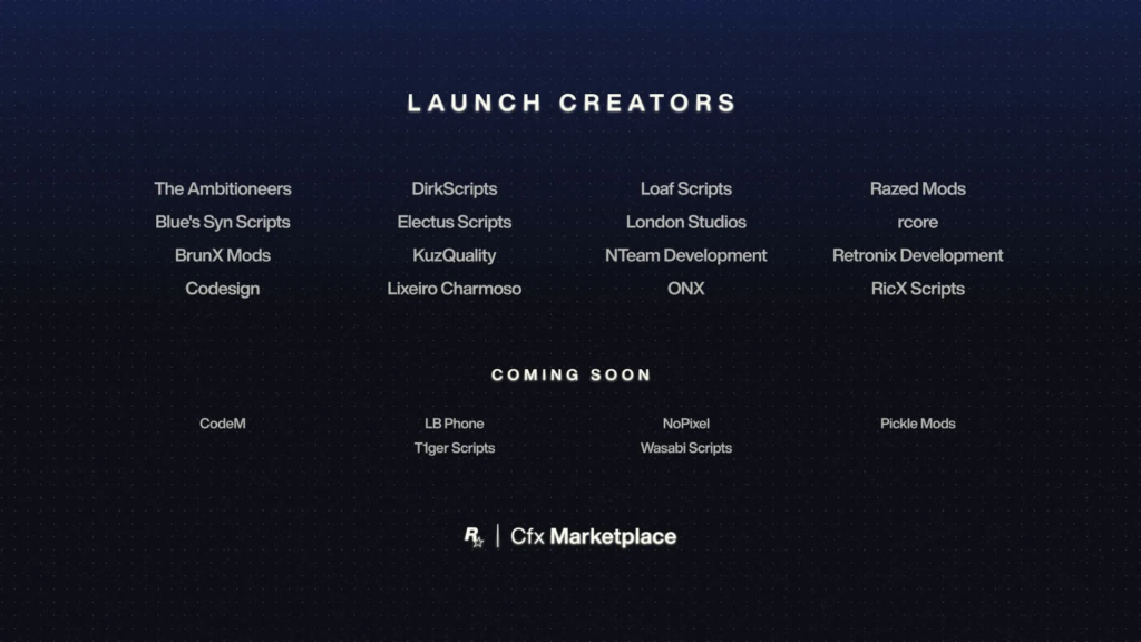 До першої хвилі маркетплейсу вже долучилися відомі розробники модів. Серед них The Ambitioneers, Blue's Syn Scripts, BrunX Mods, Codesign, DirkScripts, Electus Scripts, KuzQuality, Lixeiro Charmoso, Loaf Scripts, London Studios, NTeam Development, ONX, Razed Mods, rcore, Retronix Development і RicX Scripts.