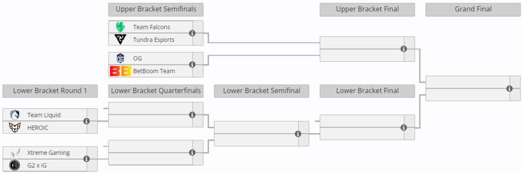 У півфінал верхньої сітки потрапили Falcons, OG, Tundra Esports і BB. З першого раунду нижньої сітки шлях у плей-оф почнуть Liquid, G2.iG, HEROIC і Xtreme Gaming.