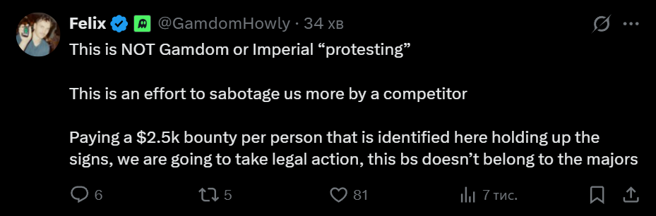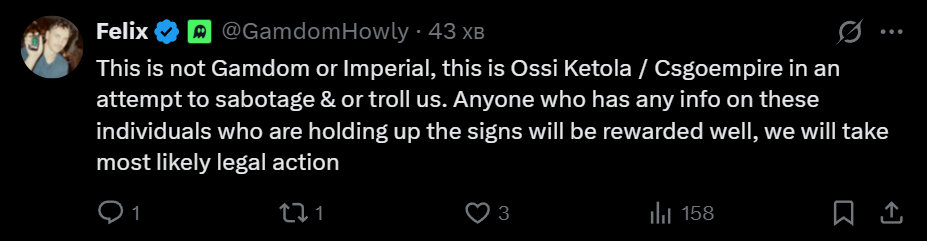 Власник Gamdom заявив, що компанія розцінює інцидент як спробу саботажу та пообіцяв винагороду у $2,5 тис. за ідентифікацію кожної особи, яка стояла з плакатом. Також Gamdom планує подати юридичну скаргу, зазначивши: