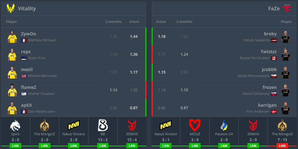 Першим гранд-фіналістом є Team Vitality, які підходять до матчу в статусі фаворита. Команда почала турнір з Stage 3, який пройшла зі статистикою 3-1. Потім у плей-оф колектив здолав The Mongolz (2:0) і Spirit (2:0).