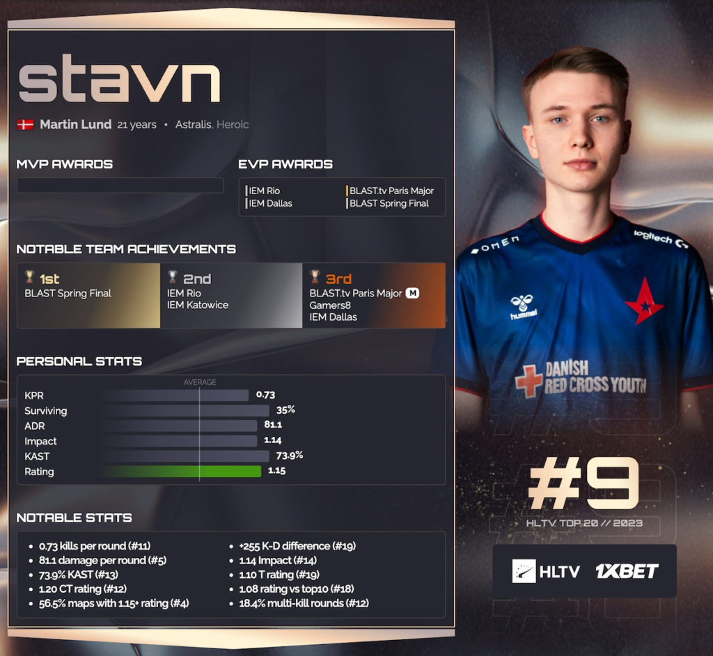 Данець Мартін stavn Лунд посів дев’яте місце в рейтингу кращих гравців в CS:GO/CS2 у 2023 році за версією порталу HLTV. Його середній рейтинг за рік склав 1.15, також він мав високий ADR (81,1) і відіграв 56.5% мап з рейтингом більше 1.15.