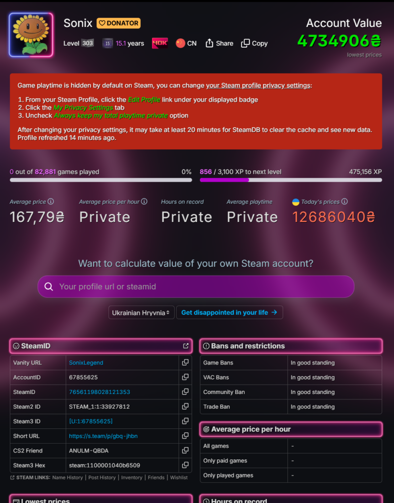 Улюбленою грою рекордсмена залишається безкоштовний кооперативний шутер Alien Swarm від Valve, де він провів 551 годину. У профілі також зазначено, що Sonix живе в Шанхаї і користується Steam уже понад 15 років.