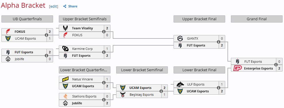 Чемпіон сітки Alpha — Enterprise Esports. Чеська організація стала справжнім відкриттям змагань. У вирішальному матчі вони змогли обійти досвідчений турецький клуб FUT Esports, здобувши перемогу 2:0 (13:5 на Split і 13:9 на Bind).