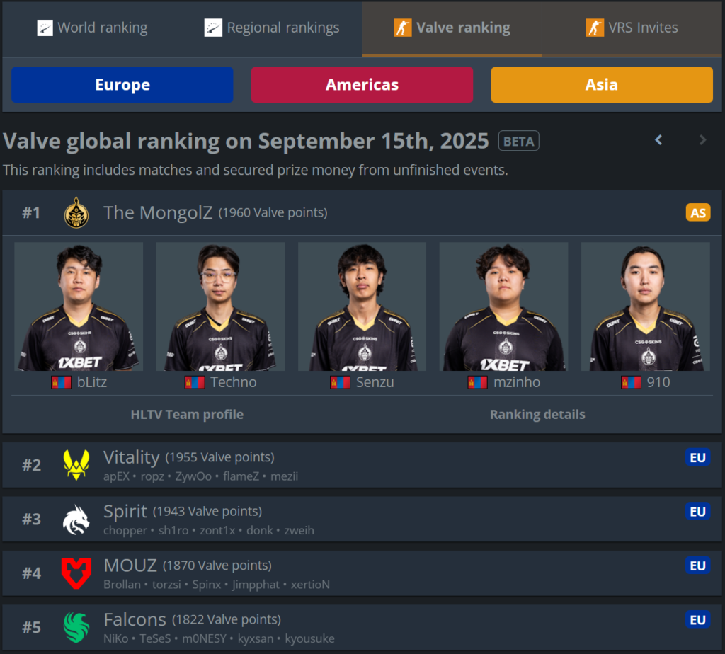 Монгольський колектив The MongolZ станом на 15 вересня 2025 року офіційно посідає перше місце у глобальному рейтингу Valve з CS2 (1960 очок). Вони обійшли Vitality (1955 очок) та Spirit (1943 очки).