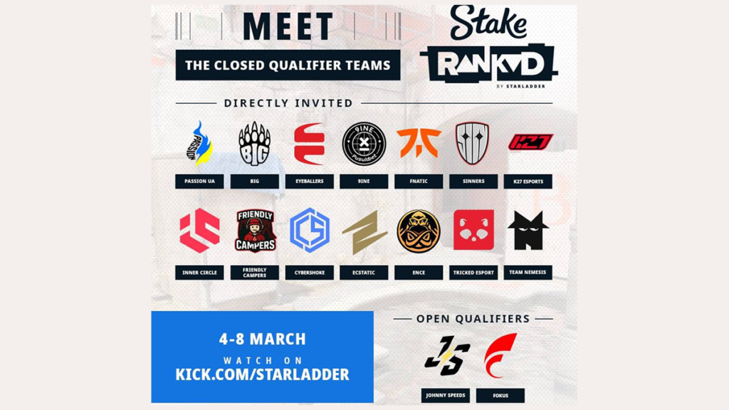 Команди позмагаються у форматі Single Elimination за два слоти на Stake Ranked: Episode 1, який пройде з 1 по 4 квітня, безпосередньо перед роздачею запрошень на Мейджор.