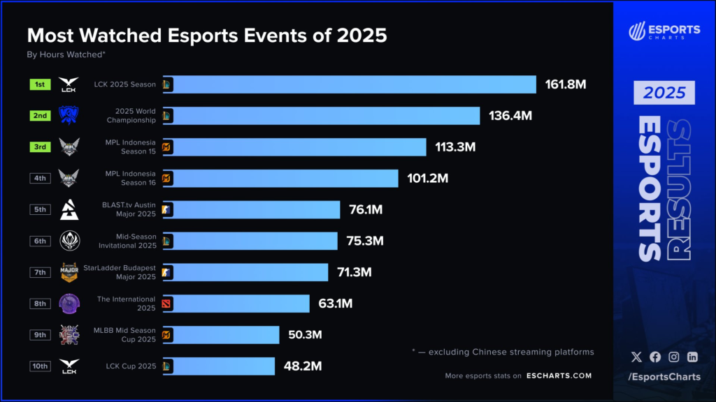 За годинами переглядів на першому місці LCK 2025 Season, який згенерував 161.8 млн годин переглядів. Worlds 2025 за цим показником на другому місці – 136,4 млн, а MPL Indonesia Season 15 третій – 113,3 млн.
