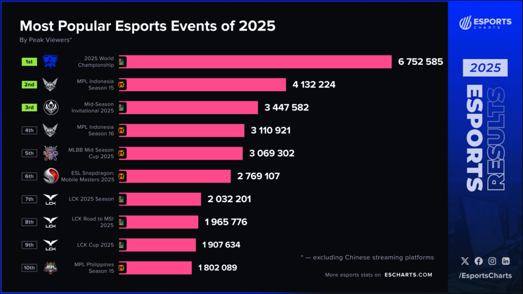 За піковим онлайн у цьому році на першому місці Worlds 2025 з League of Legends. Чемпіонат в піку дивилося понад 6.7 млн глядачів. Також до топ-3 входять MPL Indonesia Season 15 і Mid-Season Invitational 2025, які зібрали в піку 4,1 млн і 3,4 млн глядачів.