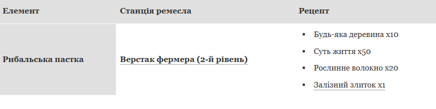 Рибальські пастки можна заряджати рибною наживкою, яка також створюється на фермерському верстаті. Наживка скорочує час активації пастки та допомагає ловити рідкіснішу рибу. Однак під час фарму сольових блоків її краще не використовувати, оскільки вона підвищує шанс упіймати саме рибу, а не сторонні предмети.