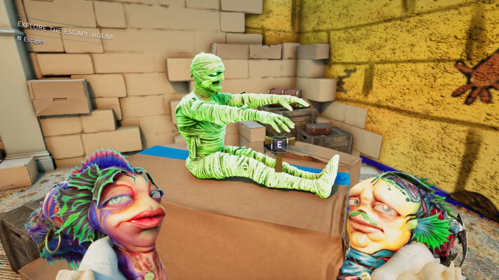 Одразу після входу активуйте сигналізацію в кутку праворуч. Дочекайтеся, поки прокинеться зелена мумія. Вона передасть ключ із символом анкха, який потрібно вставити в слот біля вхідних дверей. Після виходу стане зрозуміло, що будівлю поки неможливо залишити, адже вихід виявляється лише стіною з намальованим фасадом «Twilly’s No Escape».