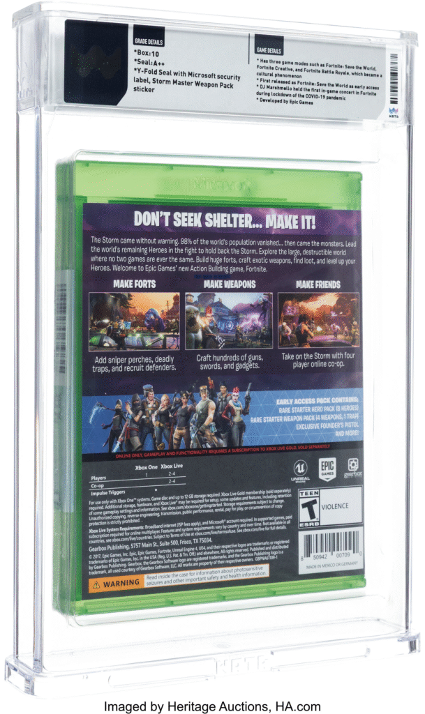 Екземпляр отримав максимальну оцінку Wata 10 A++, що практично не трапляється навіть серед цінних ретро-видань. Видавцем фізичної версії була компанія Gearbox, а всередині містилася рання збірка гри з режимом Save the World та косметичним набором Storm Master Weapon Pack. Режиму Battle Royale тоді ще не існувало, його додали пізніше оновленням.