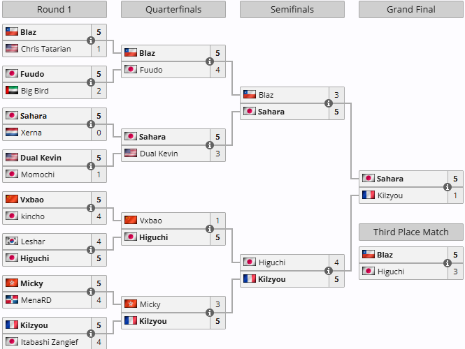 У плей-оф Sahara продемонстрував стабільний результат, перемігши у чвертьфіналі Xerna (5:0), у півфіналі — Blaz (5:3), і завершивши виступ перемогою над Kilzyou у фіналі. У матчі за третє місце чилієць Blaz переміг японця Higuchi з рахунком 5:3.