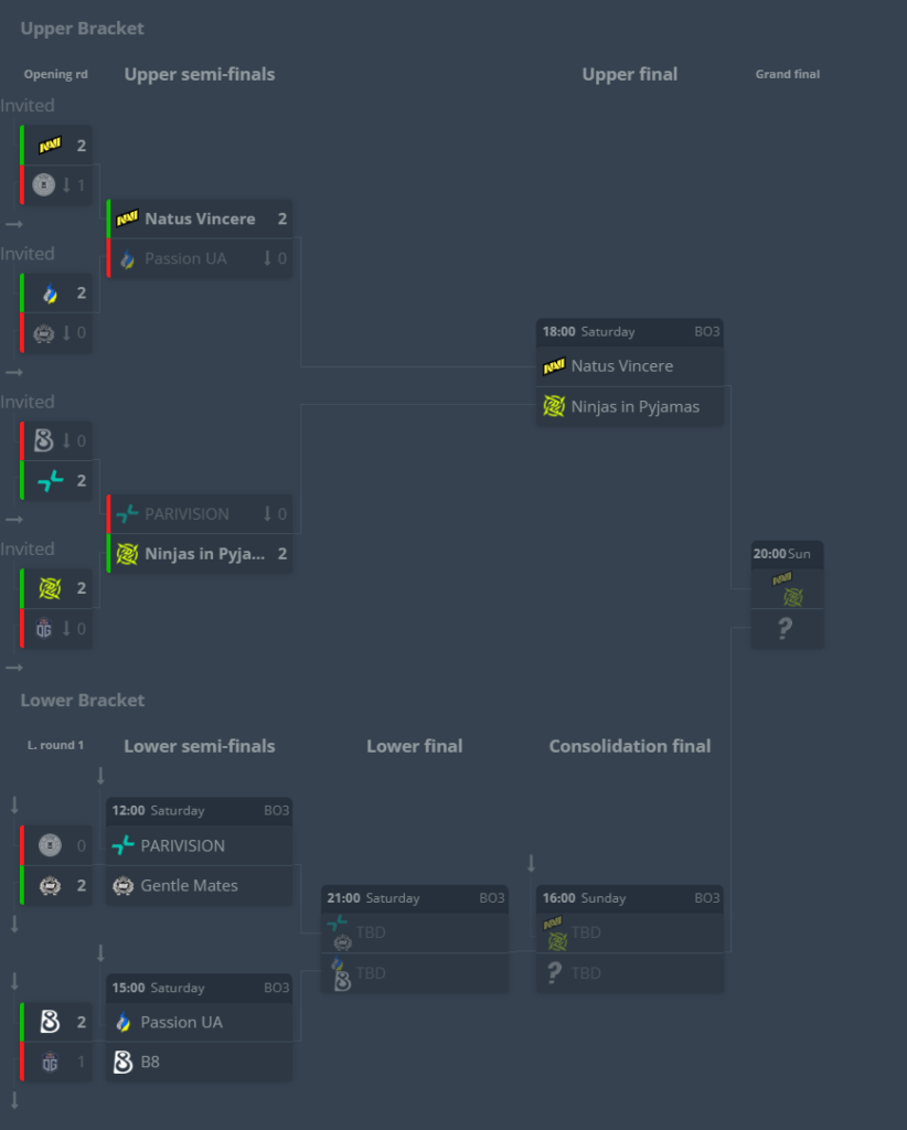 Разом із цим турнір залишили перші учасники. 9INE поступилися іспанцям із Gentle Mates, а OG не змогли втримати шалений камбек суперників у матчі проти B8: програли на другій мапі після переваги 12:5, а згодом і на вирішальній, не дотиснувши гру з рахунку 9:6.