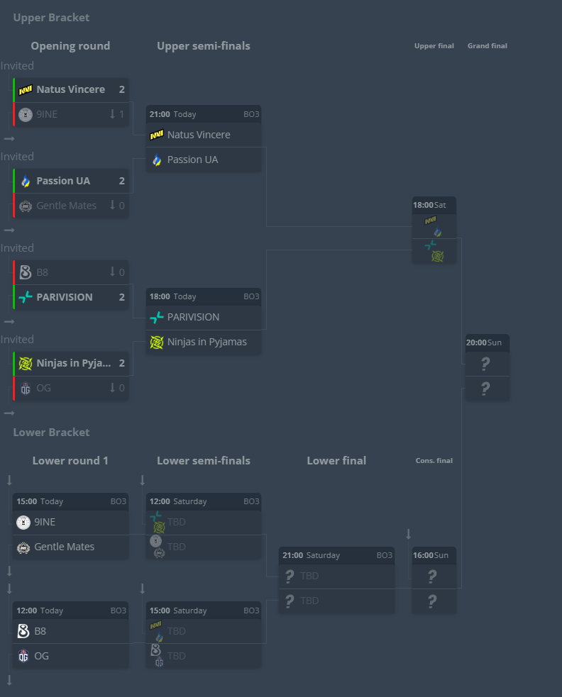 Таким чином, після першого ігрового дня ми вже знаємо пари півфіналістів верхньої сітки. У той же час команди, які поступилися в стартових поєдинках, опинилися в нижній сітці та тепер змушені боротися за виживання. Там на нас чекають матчі Gentle Mates – 9INE та B8 – OG.