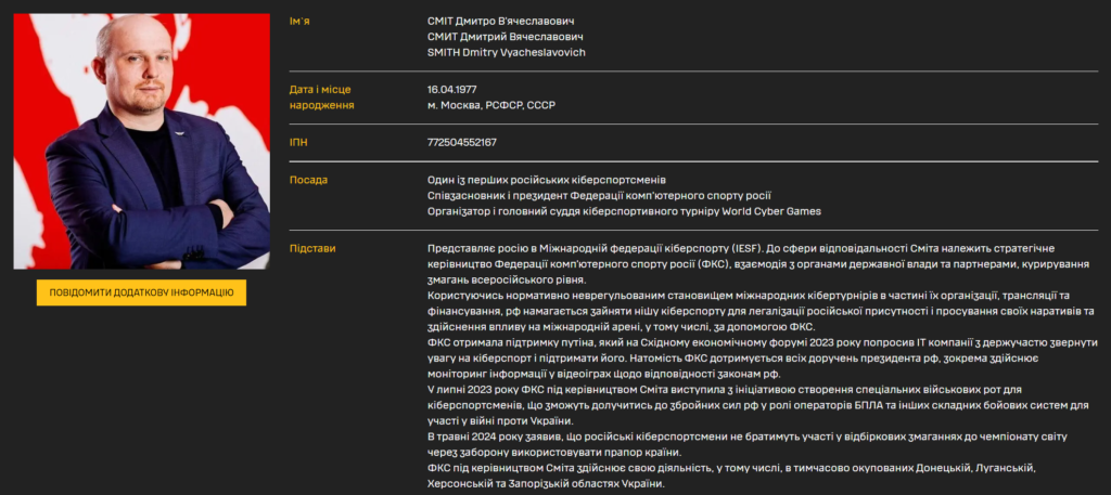 Крім того, Федерація комп’ютерного спорту росії під керівництвом Сміта здійснює свою діяльність на тимчасово окупованих територіях Донецької, Луганської, Херсонської та Запорізької областей України.