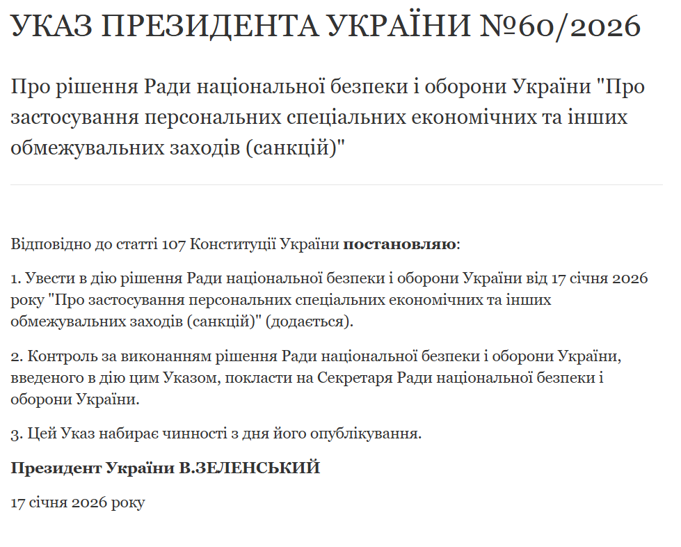 Президент України Володимир Зеленський увів у дію рішення Ради національної безпеки і оборони щодо застосування санкцій проти трьох фізичних та двох юридичних осіб російської федерації. Відповідний указ оприлюднений на офіційному сайті глави держави.