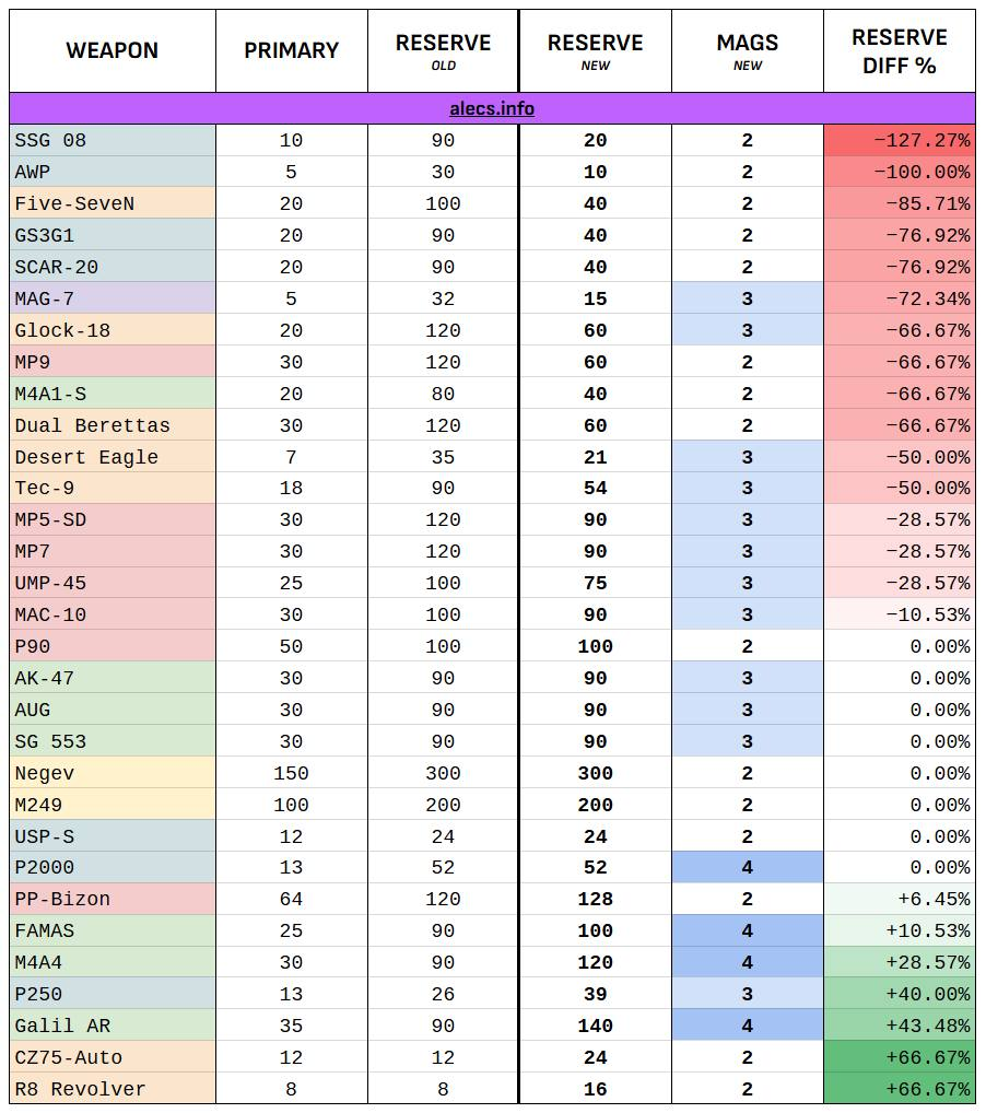 Разом із цим Valve переглянули баланс боєзапасу: більшість видів зброї тепер мають приблизно три повних магазини в резерві, але є винятки. Таблицю змін кількості набоїв опублікували нижче: